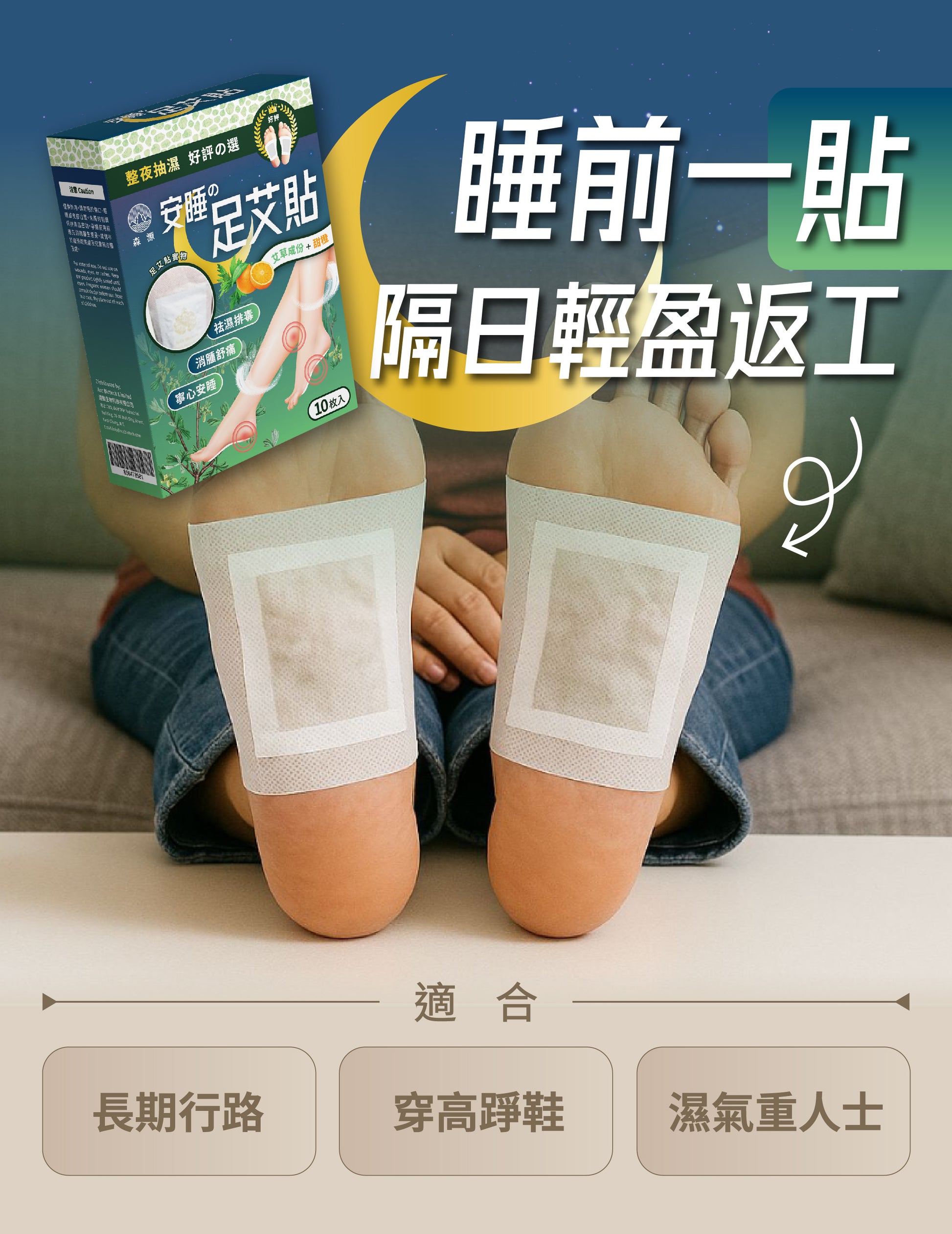 安睡足艾貼結合傳統艾草祛濕理論及甜橙芳香療法,幫助改善氣血解決日常腳部困擾!